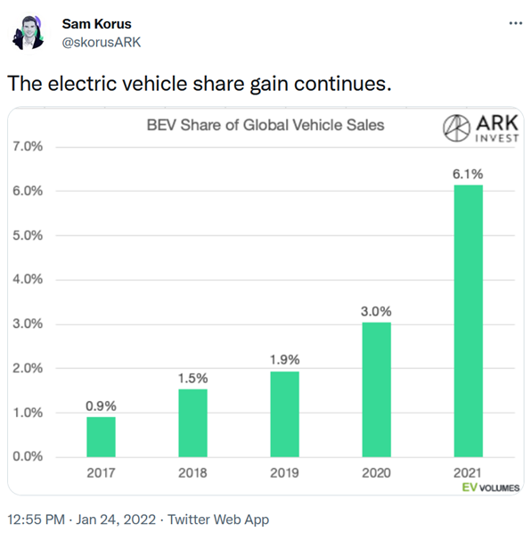 Our thesis is playing out pretty much as we expected. Autonomous driving technology is advancing rapidly and being incorporated into more and more vehicles, and electric vehicle sales and market share are in the early stages of hockey-stick growth, as you can see in this chart: