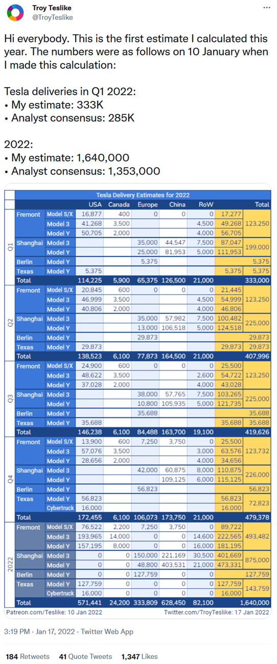 3) Troy Teslike's predictions have been quite accurate in the past – here's his forecast for 2022 deliveries:
